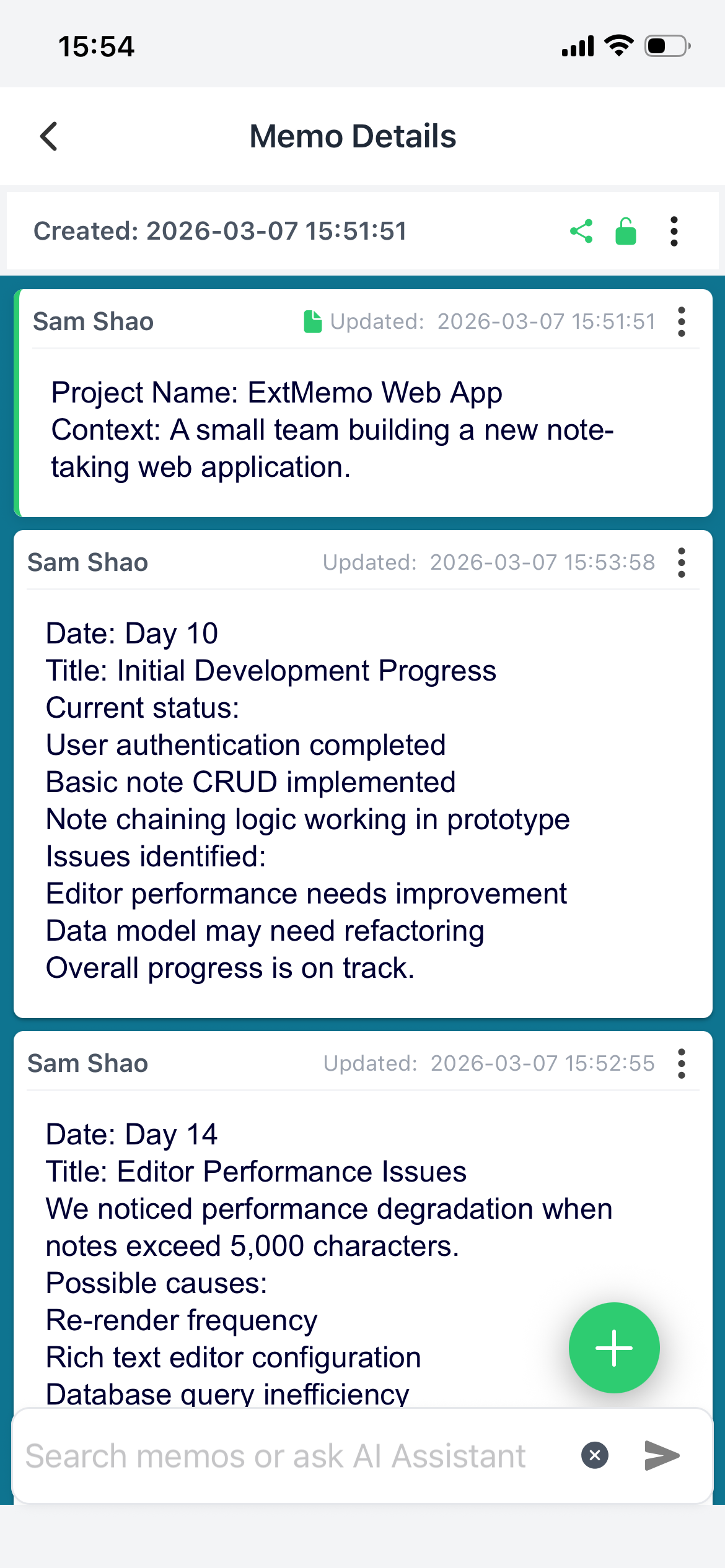 Notes are connected in a continuous chain so ideas, tasks, and events stay in context. Each entry includes an automatic timestamp, helping you record moments, revisit past thoughts, and clearly see how your work or life unfolds over time.